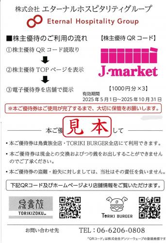 鳥貴族株主優待券(エターナルホスピタリティ)3000円分(1000円×3枚)~2026年4月30日
