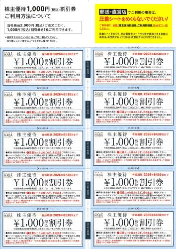 ハーバー優待(HABA)10000円(1000円×10)オーダーシート、カタログ無 26/6/30