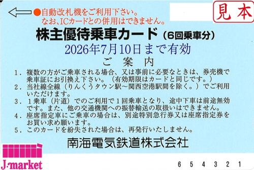 南海電気鉄道 株主優待乗車証 回数券式 (6回乗車カード) 2026年7月10日まで