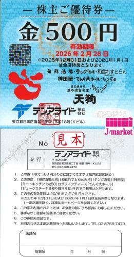 テンアライド株主優待券 (天狗) 500円 有効期限:2026年8月31日