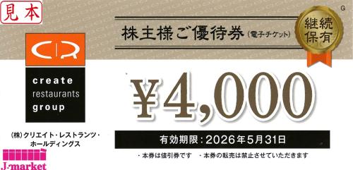 クリエイトレストランツホールディングス株主優待券 4,000円 有効期限:2026年5月31日