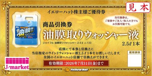 イエローハット株主優待 油膜取りウォッシャー液2.5ℓ 商品引換券 2026年7月31日まで