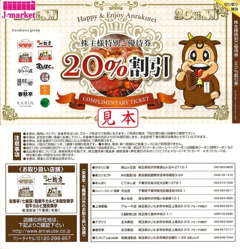 安楽亭・七輪房・国産牛カルビ本舗安楽亭・からくに屋・上海菜館 20%割引株主優待券