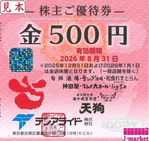 テンアライド株主優待券 (天狗) 500円 有効期限:2026年8月31日
