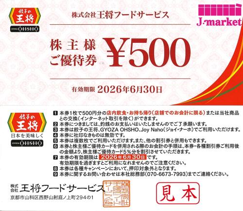 王将フードサービス(餃子の王将) 株主優待お食事券 500円 2026年6月30日